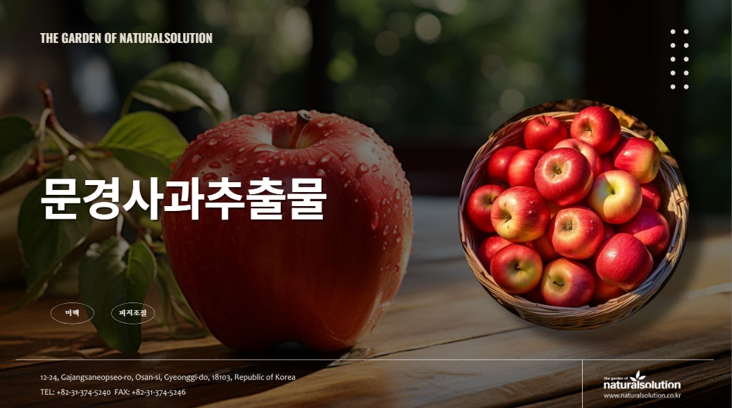 이 특별한 사과에서 얻어낸 문경사과추출물은 피부에도 놀라운 선물을 전합니다. 문경 사과는 과일산(유기산)이 풍부하고, 당분이 많아 뛰어난 보습 효과를 선사하며, 아미노산의 일종인 GABA(γ-아미노락산)가 함유되어 있습니다.